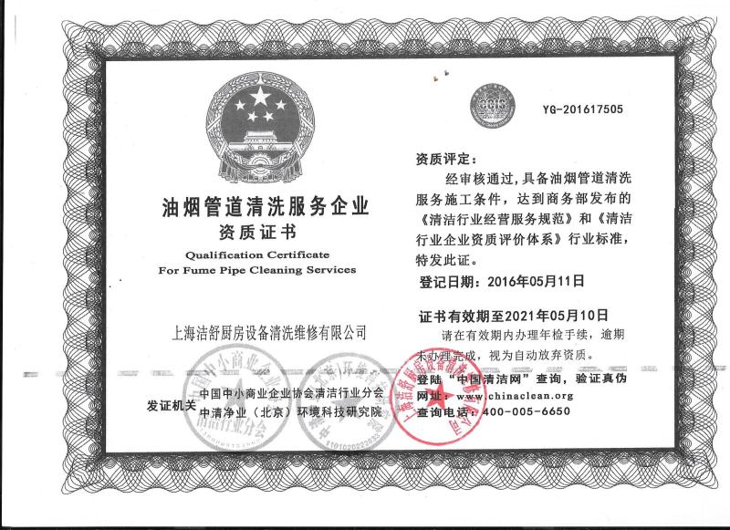 公司擁有嚴格的管理制度,專業的服務質量,精湛的技術。一直專注清洗維修業各項技術研發與服務,并不斷吸收新的技術和先進的檢測設備來滿足廣大客戶的需求。公司立足上海,服務于上海與江、浙、滬周邊客戶。公司已與百家企業、商場廣場排煙系統清洗進行長期合作服務。本公司出示營業執照、油煙管道資質證書、工人及施工設備。