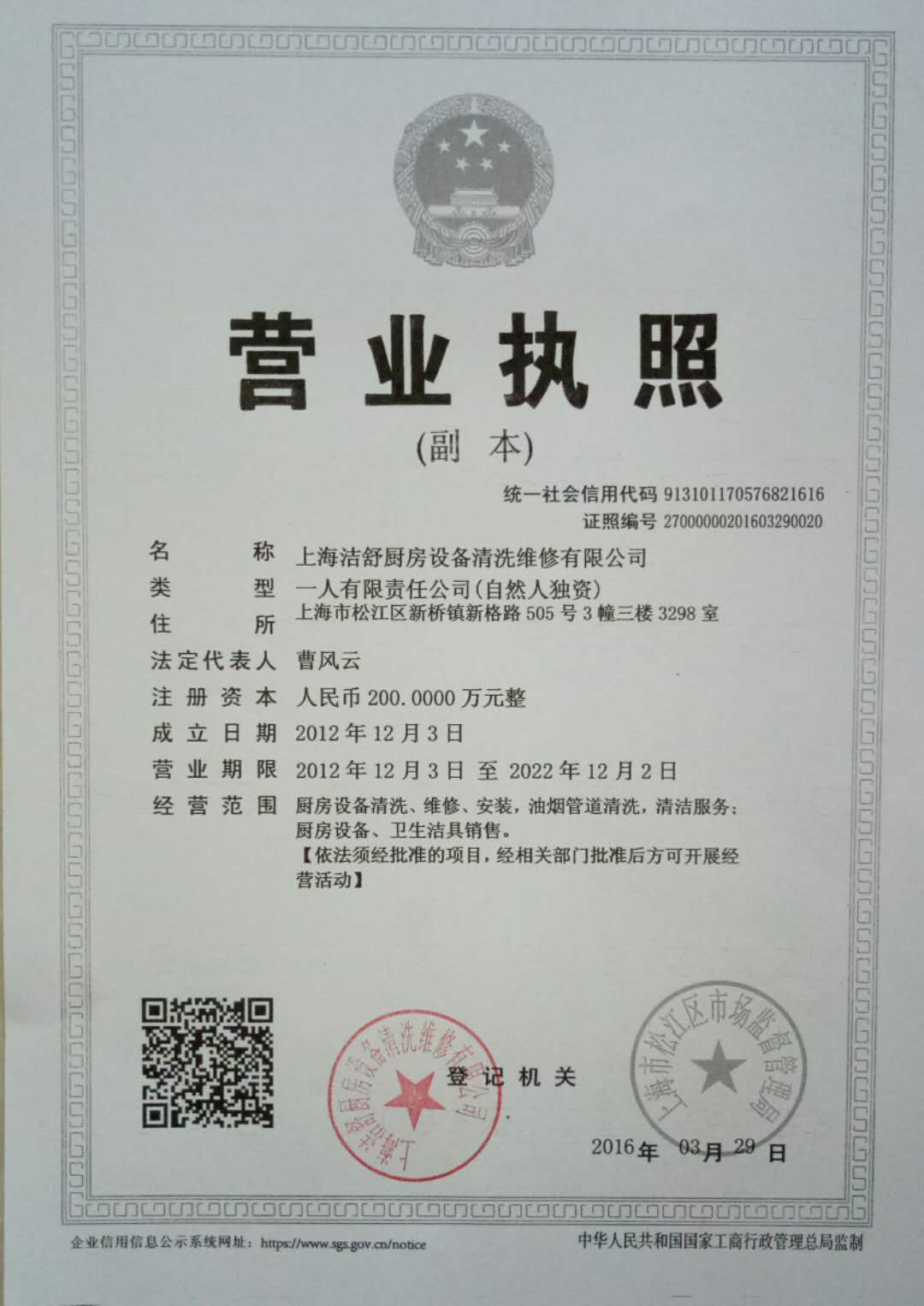 上海潔舒廚房設備清洗維修有限公司是經過工商注冊,擁有合法經營執照的正規企業,主要從事企事業、酒店、賓館、大型商場、廣場、超市、政府機構集團、(大 中 小)型企業、醫院、車站、學校、工廠、茶樓、咖啡廳、ktv娛樂場所等各種使用排風系統設備的餐廳廚房設備清洗、維修、銷售、安裝。同時可為每位家庭用戶提供油煙機清洗維修服務,廚房清洗服務。